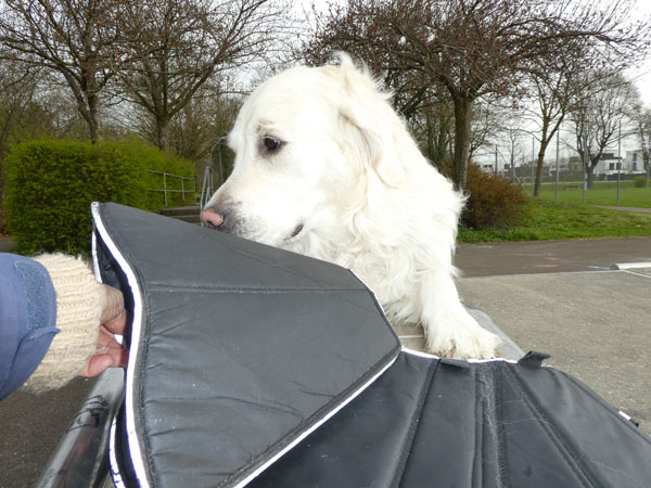 Das Anlegen der Halskrause war anfangs wegen des Geräusches des Klettbandes (beim Abnehmen) für Mia unangenehm und irritierend. Deshalb haben wir vorher das Geräusch mehrfach mit ihr geübt.