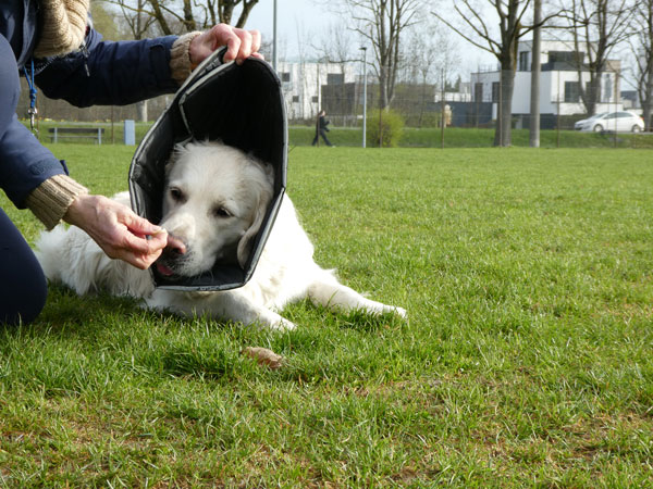 - Beende die Übungseinheiten stets mit einem positiven Erlebnis, damit dein Hund die Halskrause mit etwas Angenehmem verbindet.