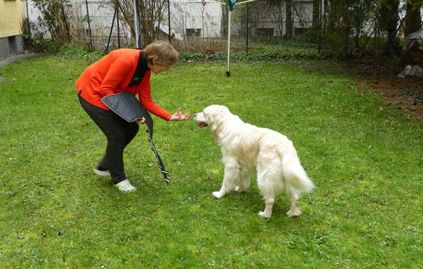Als visuelles Handsignal benutzten wir das Öffnen der Finger zu einer Blüte, was ihr mehr Sicherheit gab, als das Zeigen des Zeigefingers in die Höhe. Dieses Zeichen war schon „besetzt“ als Kommunikationsmittel für „Sitz“. Wir haben dieses Zeichen eingesetzt immer in Kombination mit dem verbalen Signal: „anziehen“, dann haben wir einen kurzen Moment lang gewartet und schließlich konnten wir die Halskrause umlegen.